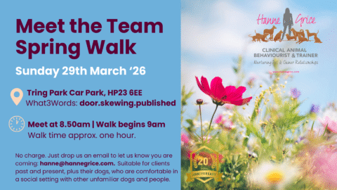 Join me, Blaze (Chief Canine Consultant), and some of our team and clients with a spring in our step, for a stroll around Tring Park. It’s an excellent opportunity to meet others, chat with dogs, and enjoy a morning potter in good company – and celebrate our 20th Anniversary in business. There’s no booking required, no payment. Just email us so we have a rough idea of numbers. Then, turn up with your dog (if they’re happy in a social setting with unfamiliar dogs and people). We recommend you bring water, poop bags, a long training line if your dog’s recall is still being worked on, as well as your dog’s favourite rewards, and walk along with us.